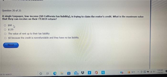 Solved Question 20 Of 25 A Single Taxpayer Low Income 0 Chegg Com